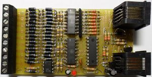 Auf der dargestellten Platine befinden sich zwei Gleisbesetztmelder mit je acht Eingängen. Die rechte Schaltung ist leider nicht funktionsfähig.