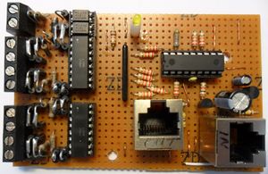 Eine Kombination aus einem Rückmelder mit 4014 und 4044 mit zusätzlichen PIC für die Schaltausgänge von Digital-Bahn.de.